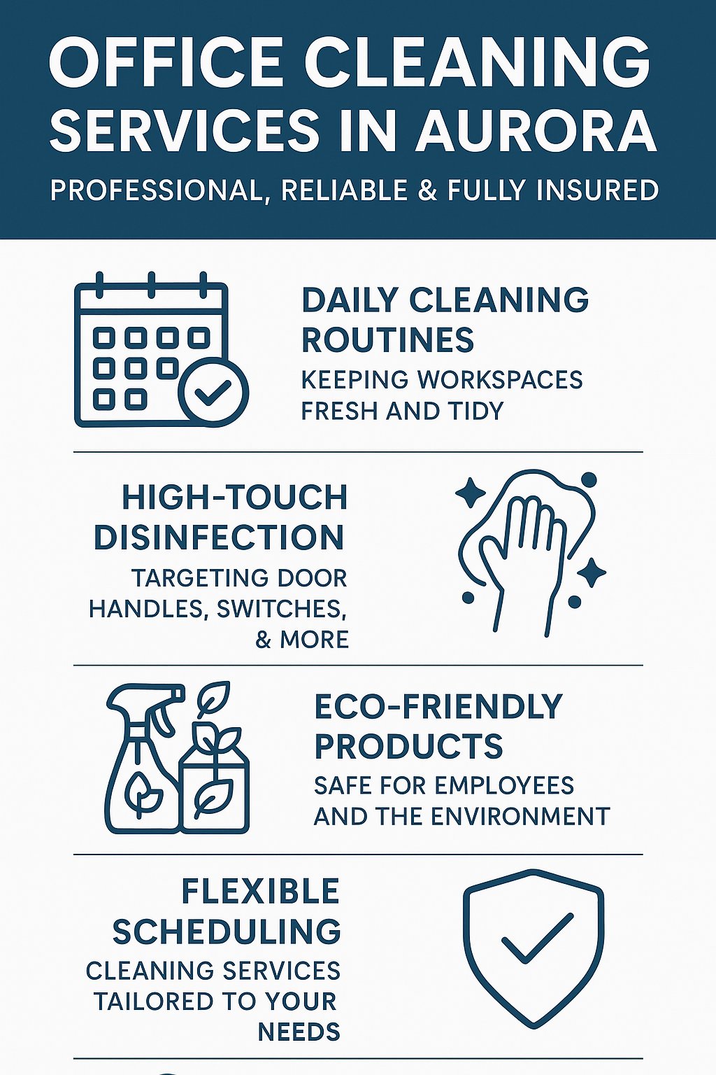 This visual guide highlights why businesses across Aurora trust us with their office cleaning needs. It outlines the core services we provide, the safety measures we follow, and the value we bring to every workspace we maintain.